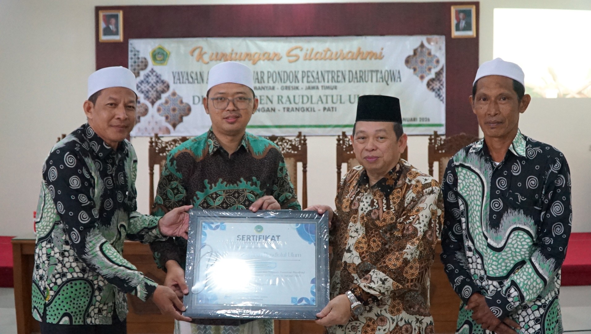 Guyangan — Pesantren Raudlatul Ulum Guyangan, Trangkil, Pati menerima kunjungan silaturahmi Yayasan Al-Munawwar Pondok Pesantren Daruttaqwa (PPDT) Suci, Manyar, Gresik, Jawa Timur, pada Senin (12/1/2026). Kunjungan ini menjadi ruang perjumpaan antarpesantren untuk saling belajar, berbagi pengalaman, serta memperkuat jejaring pengelolaan pendidikan pesantren di tengah tantangan zaman.