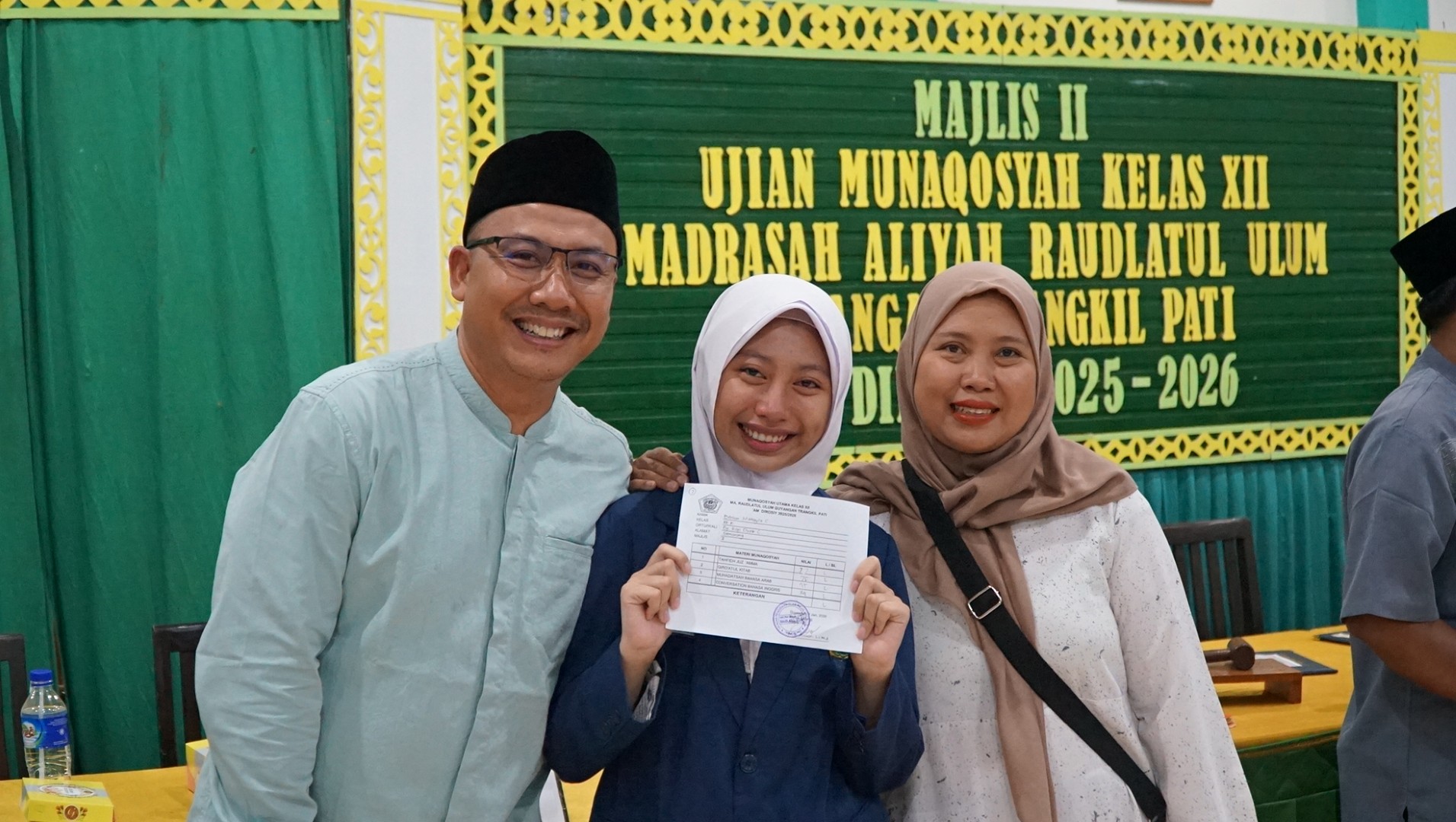 “Alhamdulillah, putri saya dinyatakan lulus dalam satu putaran. Ini menjadi kebanggaan tersendiri bagi kami sebagai orang tua, karena proses pembelajaran selama enam tahun di Pesantren Raudlatul Ulum terbukti membuahkan hasil yang memuaskan,” ungkap salah satu wali santri asal Blora saat ditemui usai pelaksanaan ujian munaqosyah.